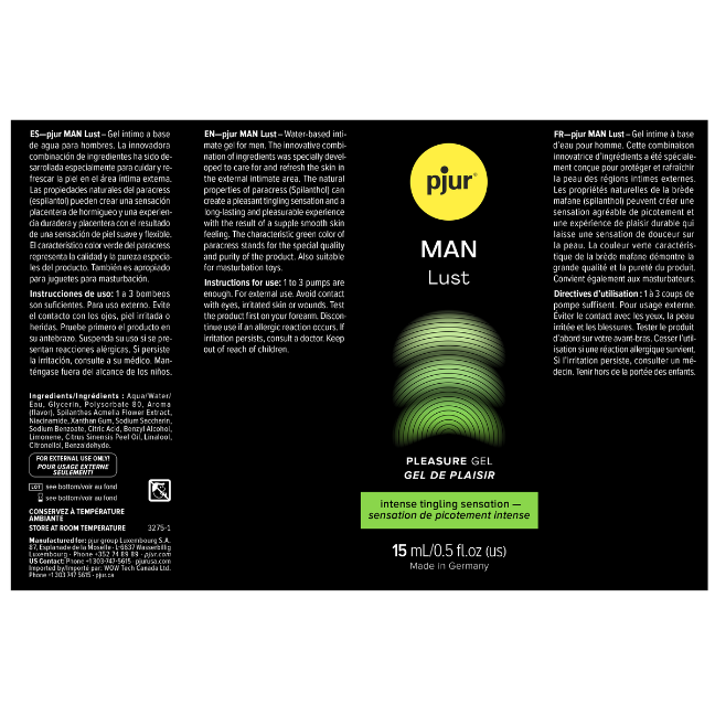 pjur MAN Lust invites men to redefine passion. Its innovative formula with natural paracress (spilanthol) activates within seconds, delivering an intense tingling sensation that lasts up to 15 minutes. The gel also nourishes and refreshes theskin in the external intimate area, leaving a silky-smooth feel. Whether used solo, with a masturbator, or as an exciting addition to foreplay, pjur MAN Lust offers versatile ways to elevate male pleasure and push boundaries. Its water-based formula ensures comfortable application and compatibility with sex toys.